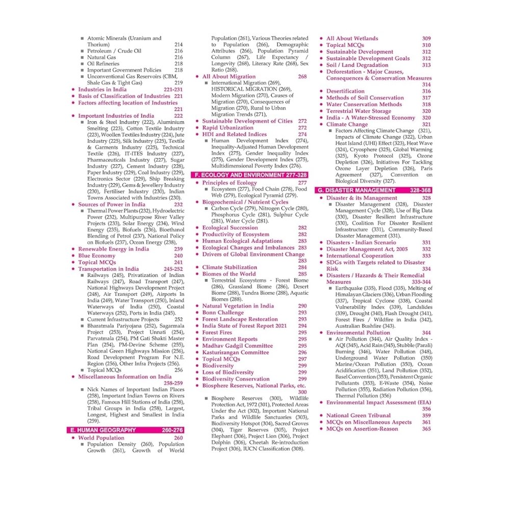 The book includes Ecology & Environment, Disaster Management, and Human Geography, presented in a structured manner with chapter-wise MCQs to help students test their understanding and improve answer accuracy. The content balances conceptual clarity with exam relevance, making it suitable for both Prelims and Mains preparation.